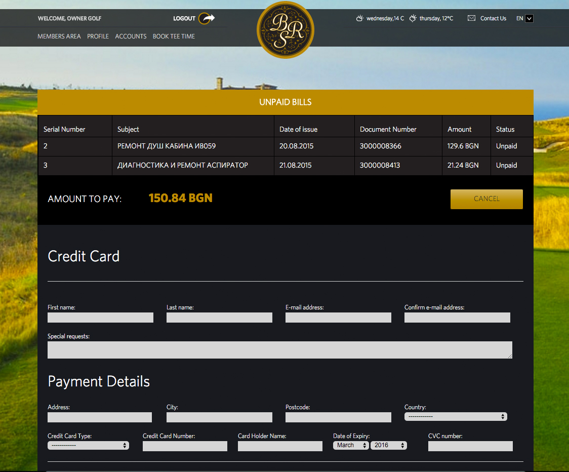 Design and development of a website module for the homeowners and members of BlackSeaRama Golf & Villas. The system provides a wide range of services including tracking rents, paying bills, as well as booking tee times at the golf course. The module is integrated with an internal system for real-time displaying of available golf slots. Users can change their passwords and make electronic payments with credit/debit cards.