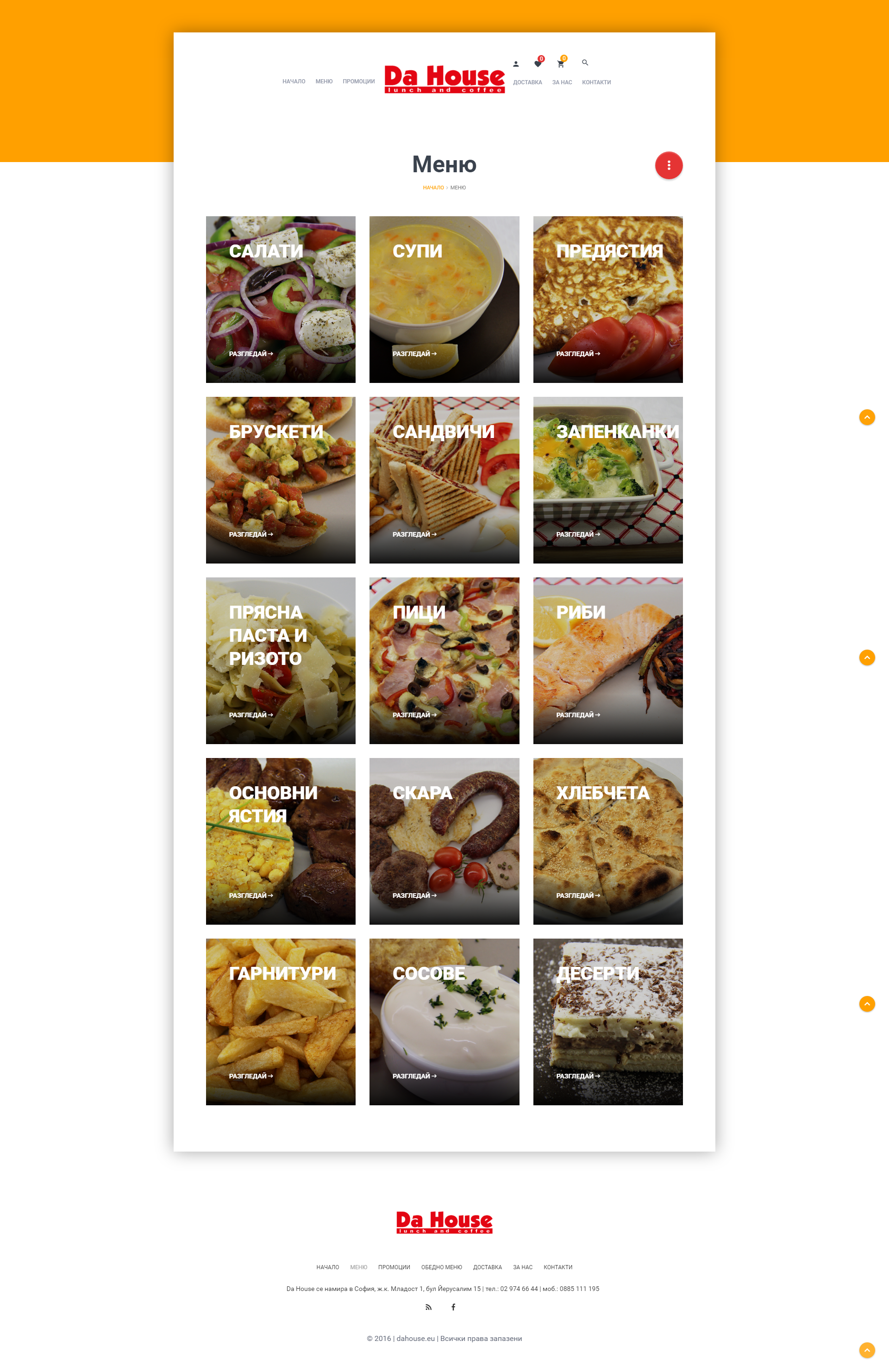Design and development of a website for the restaurant Da House. The Da House website provides compelling and user-friendly customer experience with easy navigation and mobile-optimized online ordering menu. The website features appealing gallery images of the food menu. The aim of the project is to boost sales and customer loyalty by integrating a restaurant online ordering system into the website. The site is bilingual and is built upon WordPress template.