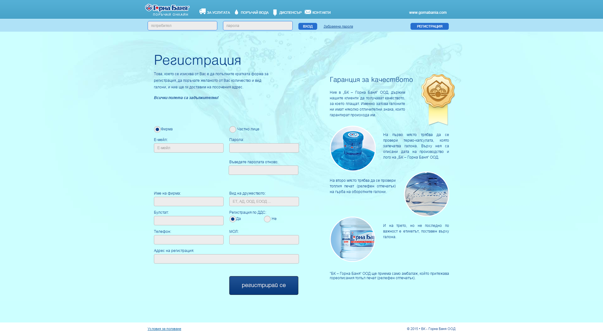 Design and development of an online orders module for Gorna Bania bottling company. The Gorna Bania online orders module includes option to order water dispensers, water gallons and all needed accessories. The module also has registration and profile, forget password and multiple addresses support. The website is built with WordPress CMS and custom designed templates for all types of pages.